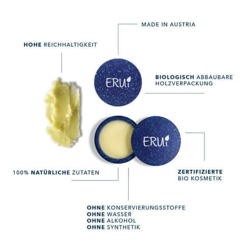 Wir bei ERUi Cosmetics produzieren BIO zertifizierte Naturkosmetik, ohne synthetische Zusatzstoffe, in einer biologisch abbaubaren, ZERO WASTE Verpackung. Die Produkte enthalten 100 % natürliche Rohstoffe aus Deutschland und Österreich, die auch für Kundinnen und Kunden mit sensibler Haut bestens geeignet sind.